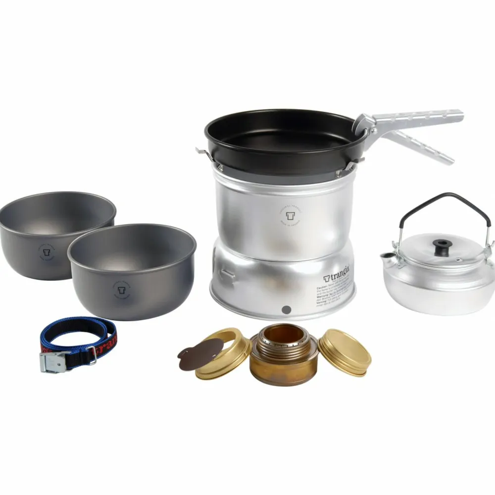 Genau richtig, um mit zwei Personen auf Tour zu gehen: Der Trangia 27-0 Spiritus Sturmkocher mit Wasserkessel! Der zweiteilige Windschutz aus Aluminium schützt den angenehm leisen arbeitenden Spirituskocher zuverlässig vor Seitenwind. Zudem leitet der Windschutz die Wärme effizient um den Topf herum, der so schneller erwärmt wird und die Energie so besser nutzt. Zwei Töpfe mit jeweils einem Liter Volumen zaubern selbst ausgefeilte Essenskreationen auf den Outdoortisch.Die Töpfe selbst lassen sich dank der hartanodisierten Beschichtung einfach reinigen und sind so auch gut vor Kratzern geschützt. Wer auf Tour gerne auch mal etwas brät, zum Beispiel die selbst gefangenen Forellenfilets im Fjell, der wird über die Pfanne mit der Non-Stick Antihaft-Beschichtung sehr glücklich sein! Für schnelle heiße Getränke verfügt dieses Set außerdem über einen kleinen Wasserkessel, so dass Kaffee und Tee jederzeit schnell zubereitet sind! So bekommt man mit dem 27-0 Spiritus Sturmkocher mit Wasserkocher von Trangia einen zuverlässigen und robusten Kocher, der einem über viele Jahre hinweg gute Dienste leisten wird!
