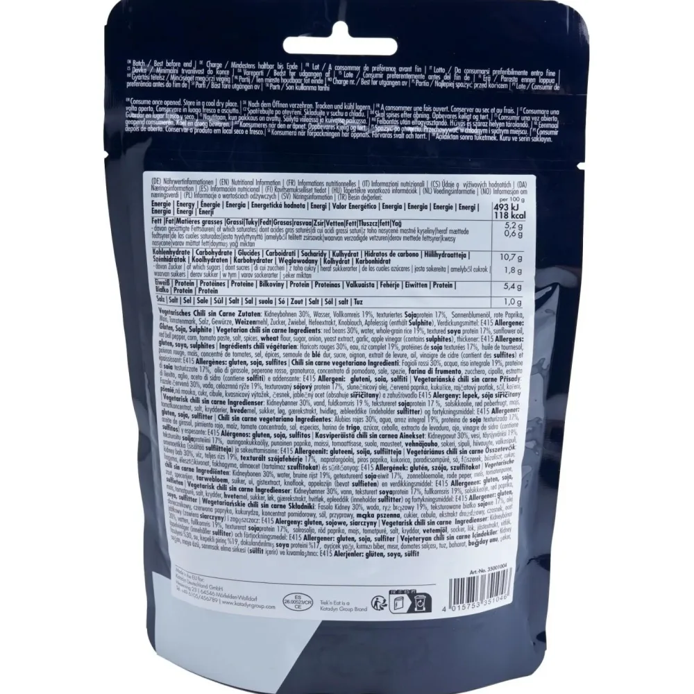 Wer sagt denn, dass man beim Trekking auf feines Essen verzichten muss? Die Spezialisten von Trek’n Eat haben da nämlich so Einiges im Angebot, unter anderem das Vegetarische Chili sin Carne! Ist einfach zuzubereiten, leicht zu transportieren, und spendet Dir die Energie, die Du brauchst, um den Weg weiterzugehen – und das ganz ohne Fleisch. Ready to eat!
