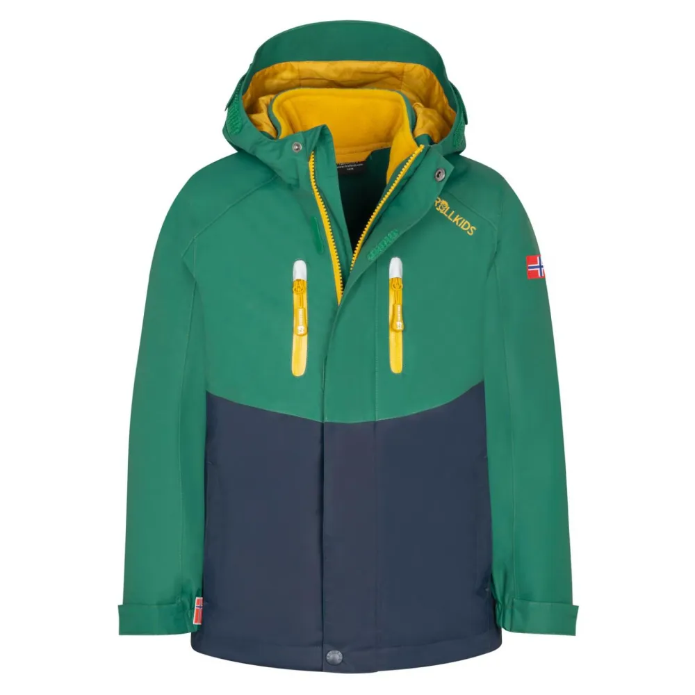 Warm, wetterfest und auf jedes Abenteuer und jedes Wetter vorbereitet: die Kid’s Bryggen 3in1 Jacket von Trollkids! Die 3in1Jacke kommt als Kombination aus wetterfester Außenjacke und einer herauszippbaren Fleece-Innenjacke. Sie kann als leistungsstarkes Duo und jeweils auch solo jedem noch so wechselhaftem Wetter ein Schnippchen schlagen!Die Außenjacke ist aus einem widerstandsfähigen, absolut wasserdichten, windabweisenden und atmungsaktiven Obermaterial gefertigt. Jeweils zwei Brust- und Einschubtaschen mit Zip packen der Kleinkram ein. Die Kapuze und die Ärmelbünde sind verstellbar und reflektierende Elemente auf dem Rücken sorgen für mehr Sicherheit. Die Innenjacke ist aus einen kuschelig-warmen Fleecegewebe gefertigt, das sich jederzeit super anfühlt. Zwei Zip-Fronttaschen gibt’s auch hier als Stauraum obendrauf. Klasse!