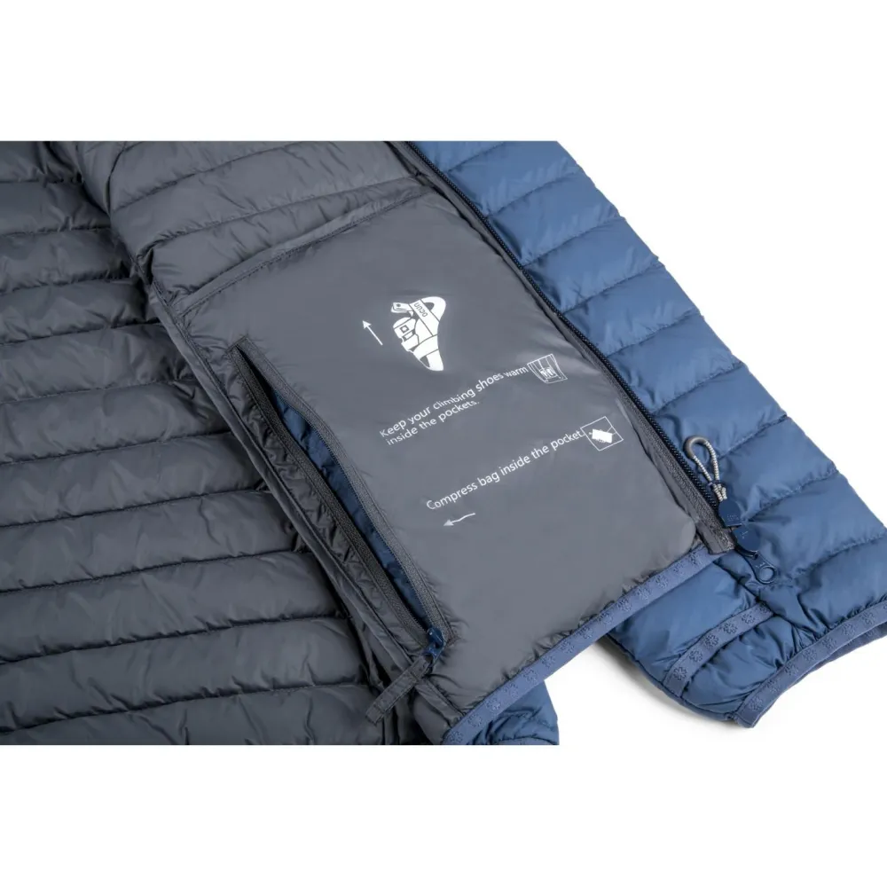 Das Obermaterial besteht zu 100 % aus recyceltem Ripstop-Nylon und ist mit einer wasserabweisenden DWR-Imprägnierung versehen. Diese verhindert, dass die Daunenfüllung mit Feuchtigkeit in Berührung kommt. Mit einer Wärmeleistung von 650 cuin speichert die Daune effektiv die Körperwärme und hält auch bei sehr niedrigen Temperaturen warm. Die Passform ist speziell auf dynamische Kletterbewegungen ausgelegt. Ein langer Rumpf und lange Ärmel mit Daumenschlaufen erleichtern Überkopfbewegungen und verbessern die Bewegungsfreiheit. Besonders praktisch sind auch die beiden Innentaschen. Hier können Kletterschuhe bequem verstaut und schnell hervorgeholt werden. Kurz: Eine Kletterjacke, bei der an alles gedacht wurde.