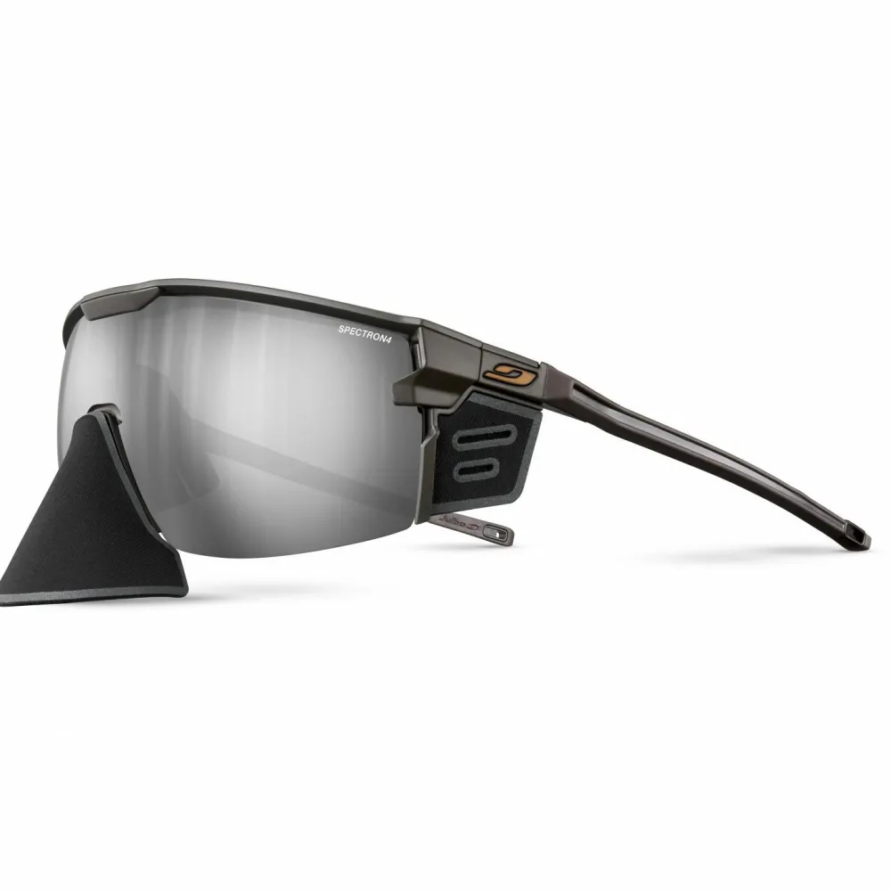Für Hoch- und Skitouren bei strahlendem Sonnenschein ist die Ultimate Cover Spectron4 (VLT 5%) von Julbo bestens geeignet. Diese Gletscherbrille bring alles mit, was es für den Einsatz im Hochgebirge und auf Gletschern braucht. Der Rahmen ist dabei äußerst leicht und gut belüftet, sodass die Brille weder störend wirkt, noch zum Beschlagen neigt. Verstellbare Bügel mit Beschichtung sorgen zusätzlichfür einen optimierten Sitz der Brille. Die große Panoramascheibe entspricht außerdem der Schutzklasse 4 und bietet so auch an Sonnentagen auf dem Gletscher ausreichend Schutz.