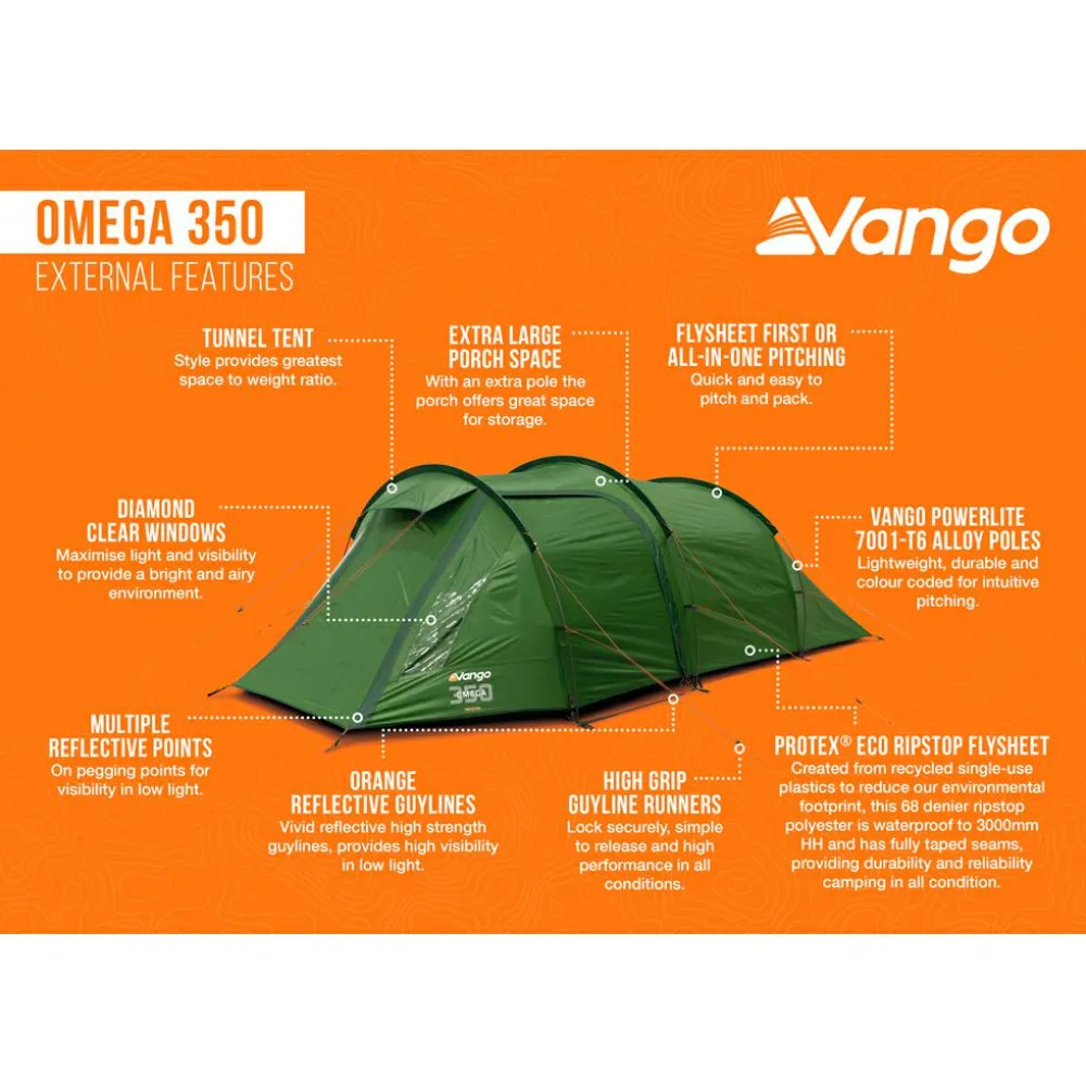 Das Omega 350-Zweipersonenzelt von Vango ist Dein idealer Begleiter für längere Camping-Ausflüge, Expeditionen und ausrüstungsintensive Aktivitäten. Dieses Zelt bietet Dir und Deinem Partner einen großen Wohnbereich mit einem extra großen Vorraum, der Dir zusätzlichen Stauraum für Deine Ausrüstung bietet. Das ProTex® Eco-Außenzelt schützt Dich bei jedem Wetter und ist aus strapazierfähigem Ripstop-Polyester gefertigt, das wasserdicht bis 3000mm HH ist. Der robuste Zeltboden aus 70 Denier starkem, PU-beschichtetem Polyester hat eine Wassersäule von 6000mm, und das Badewannen-Groundsheet ragt 10cm über das Innenzelt hinaus, um Dich auch bei rauem Wetter trocken zu halten.