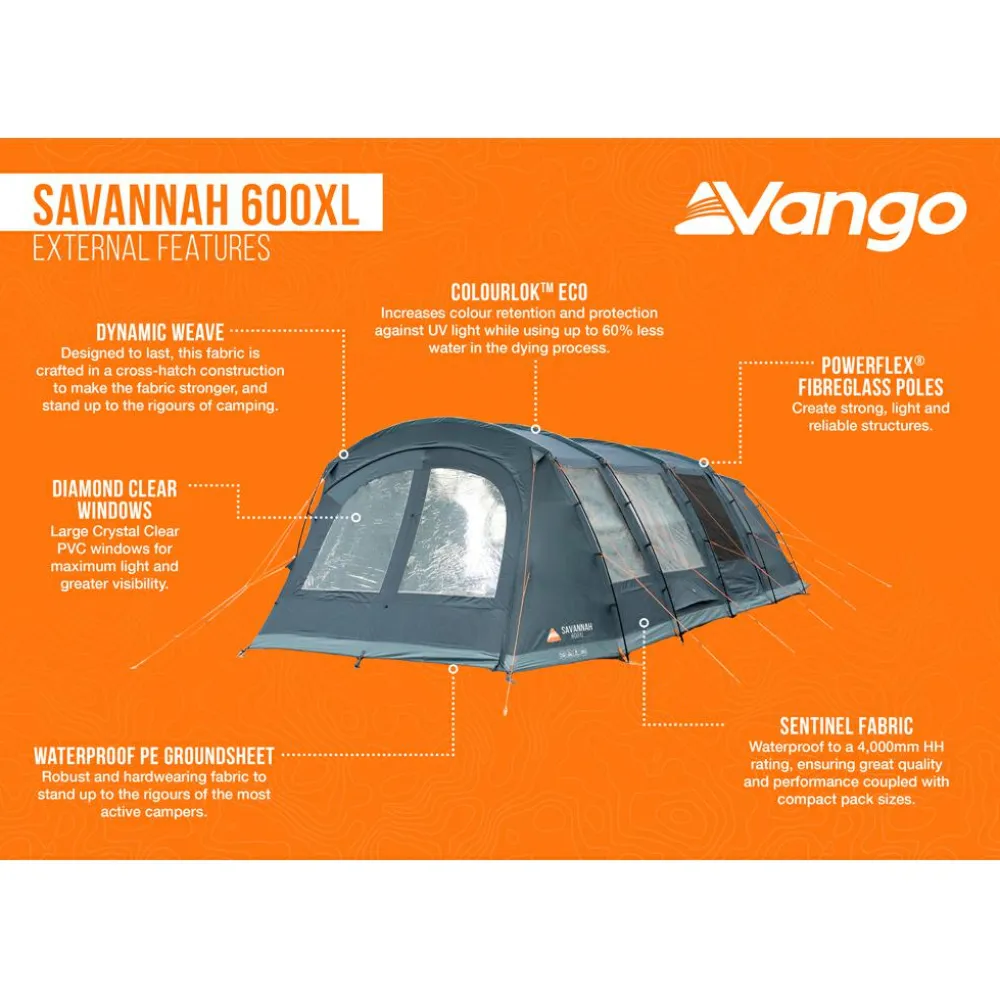 Das Savannah 600XL-6-Personen-Zelt-Package von Vango bietet Dir und Deiner Familie großzügigen Platz und Komfort für jedes Campingabenteuer. Es verfügt außerdem über ein vollständig geschlossenes, integriertes Vorzelt, das unter allen Bedingungen gut nutzbar ist und den Wohnraum deutlich erweitert. Der vollständig eingenähte Zeltboden schützt vor Zugluft und Ungeziefer, während die Belüftung über die Netztüren und die AirZone Paneele gesteuert werden kann. Mit einer Höhe von über 2 Metern ist das Zelt leicht aufzustellen und zu bewegen. Die große Vordertür kann bis zur Mitte oder ganz geöffnet werden, was Dir eine Vielzahl von Optionen für unterschiedliche Bedingungen und Verwendungszwecke bietet.