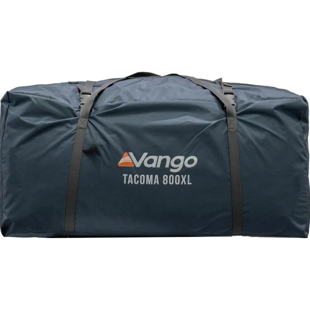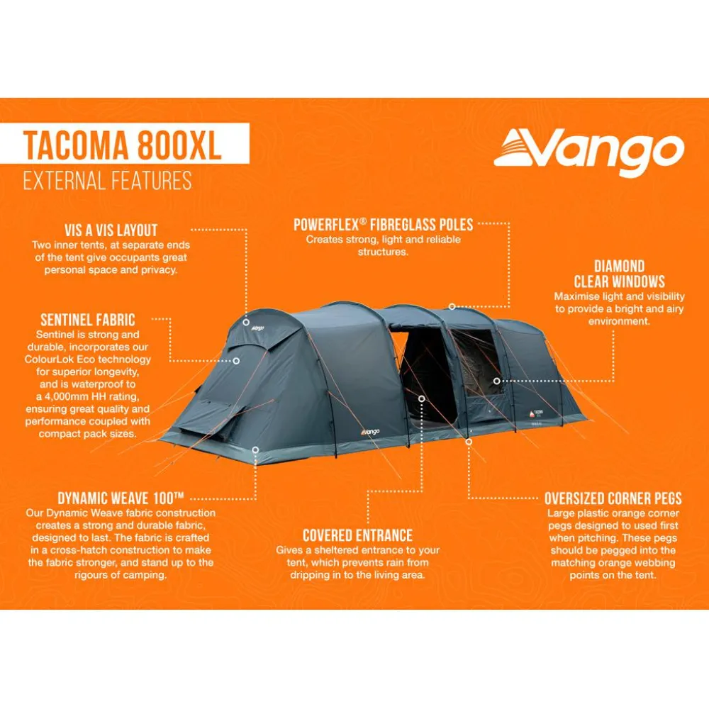 Der Wohnbereich des Tacoma 800 verfügt über ein großes Diamond Clear-Fenster, das tagsüber Licht in den Wohnbereich fallen lässt und nachts mit den aufrollbaren Kippvorhängen abgedeckt werden kann. Das Sentinel Fabric ist stark und strapazierfähig und bietet mit einer Wassersäule von bis zu 4.000 mm hohen Schutz vor Feuchtigkeit. Die im Lieferumfang inbegriffene extra Bodenplane sorgt für zusätzlichen Schutz, und außerdem für eine lange Lebensdauer des Zeltes. Mit der übergroß dimensionierten Easy Pack Carry Bag lässt sich das Zelt schnell und einfach verstauen und transportieren. Mit den Seitentüren kann durch zusätzlich zu erwerbende Aufstellstangen optional eine „Seitenmarkise“ errichtet werden, die dann eine funktionale Veranda, z.B. als schattiger Sitzplatz oder zum Verstauen zusätzlicher Ausrüstung darstellt.