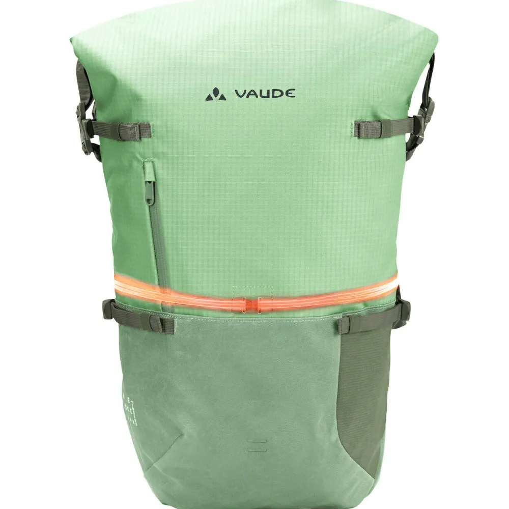 Der Citygo 23 II Daypack von Vaude bietet 23 Liter Stauraum, die bequem per Wickelverschluss verschlossen werden. Mit einer Kombination aus ergonomischen ErgoShape Schultergurten, Brustgurt und gepolstertem Vent Comfort Kontaktrücken trägt sich der schmal geschnittene Rucksack bequem im Alltag und in der Freizeit. Er ist mit einem 13,3“ großen Notebookfach ausgestattet und verfügt über eine seitliche Stretch-Tasche für Trinkflaschen, sowie einen Schlüsselhalter und eine Blinklichthalterung. Vaude fertigt den Rucksack fast vollständig aus recycelten Rohstoffen und macht den Citygo 23 II damit besonders umweltfreundlich.