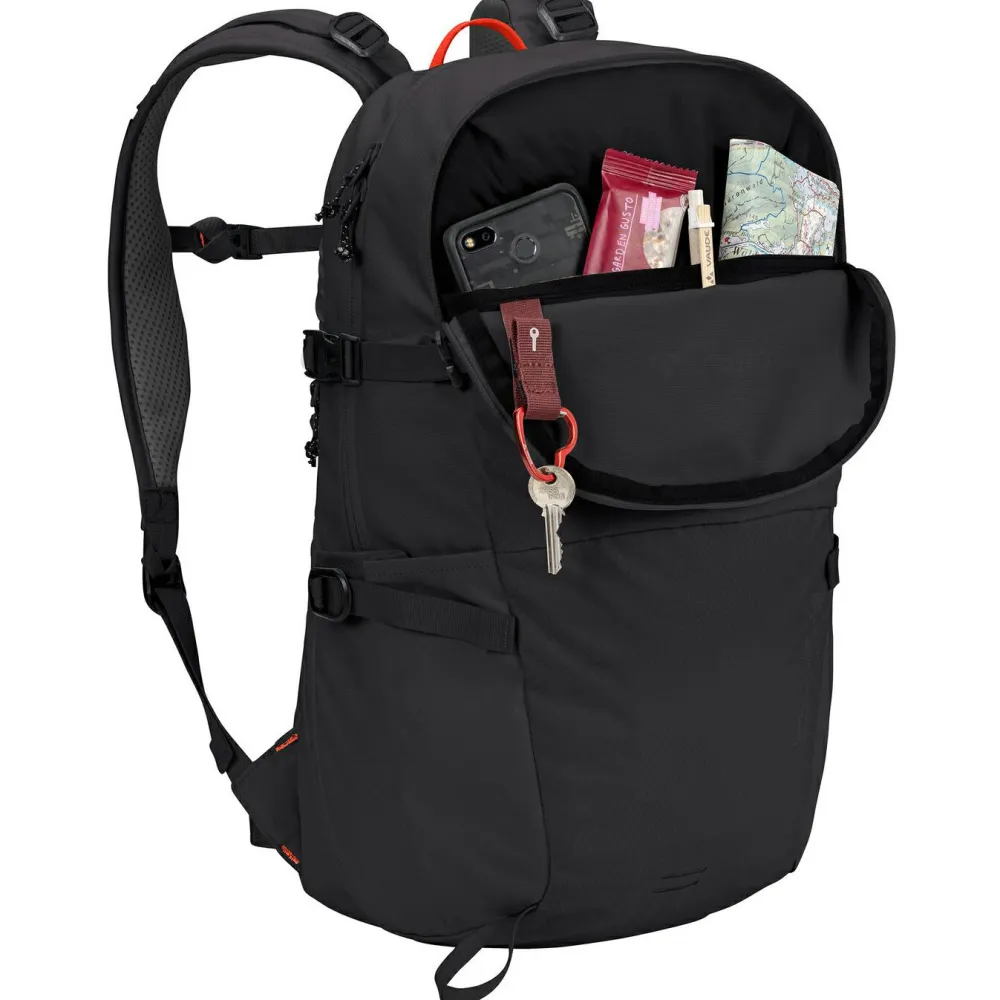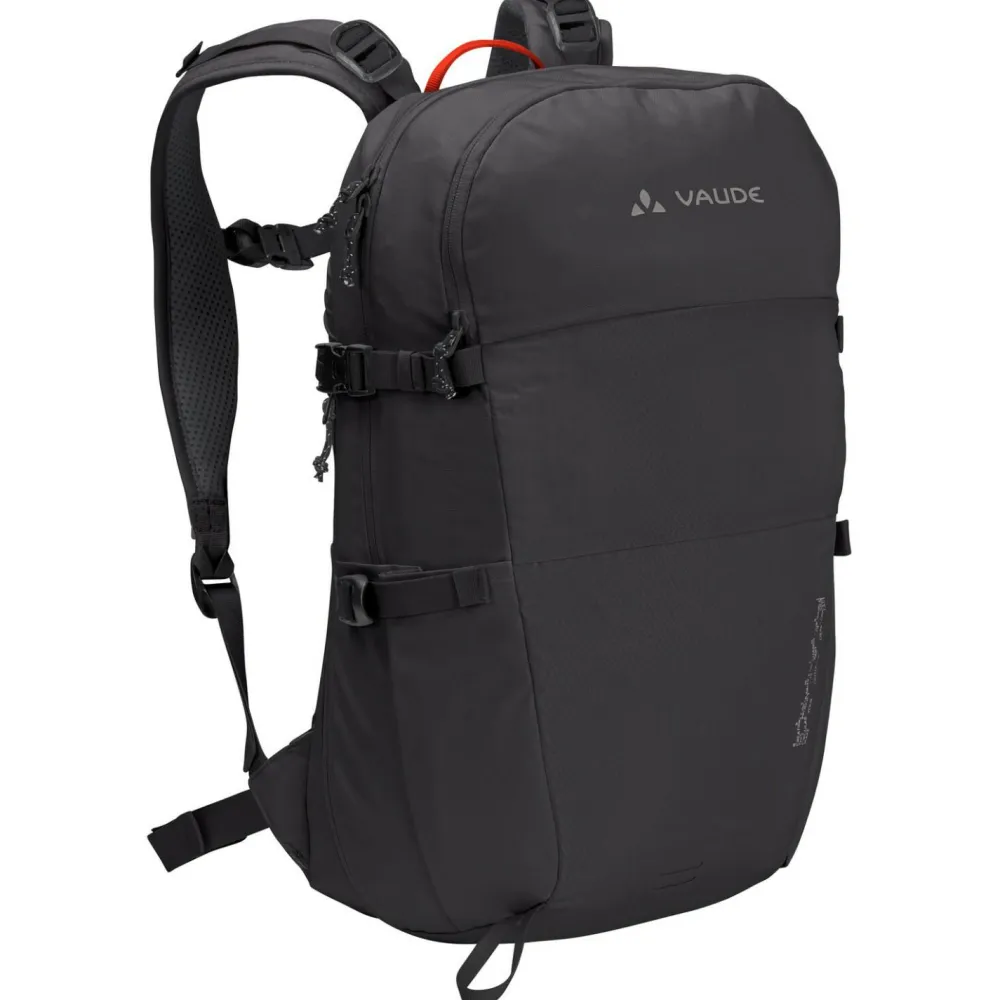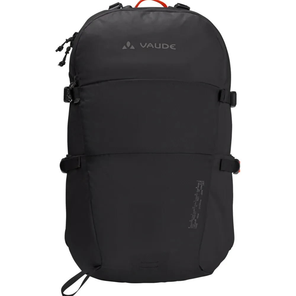 Beim Outdoorsport ist der Elope 18+4 Rucksack von Vaude besonders vielseitig einsetzbar. Er ist schmal geschnitten, verfügt über ein komfortables und gut belüftetes Tragesystem und ist für die Verwendung von Trinksystemen vorbereitet. Der Rucksack wird aus recyceltem Polyester gefertigt und vor Nässe mit PU-Beschichtung und Eco Finish Behandlung geschützt. Mittels Reißverschluss lässt sich das 18 Liter Volumen um weitere 4 Liter auf insgesamt 22 Liter vergrößern. Stockhalterung, Blinklichthalter und ein Organizerfach in der Fronttasche ergänzen den multifunktionalen Rucksack.