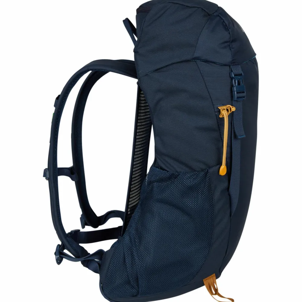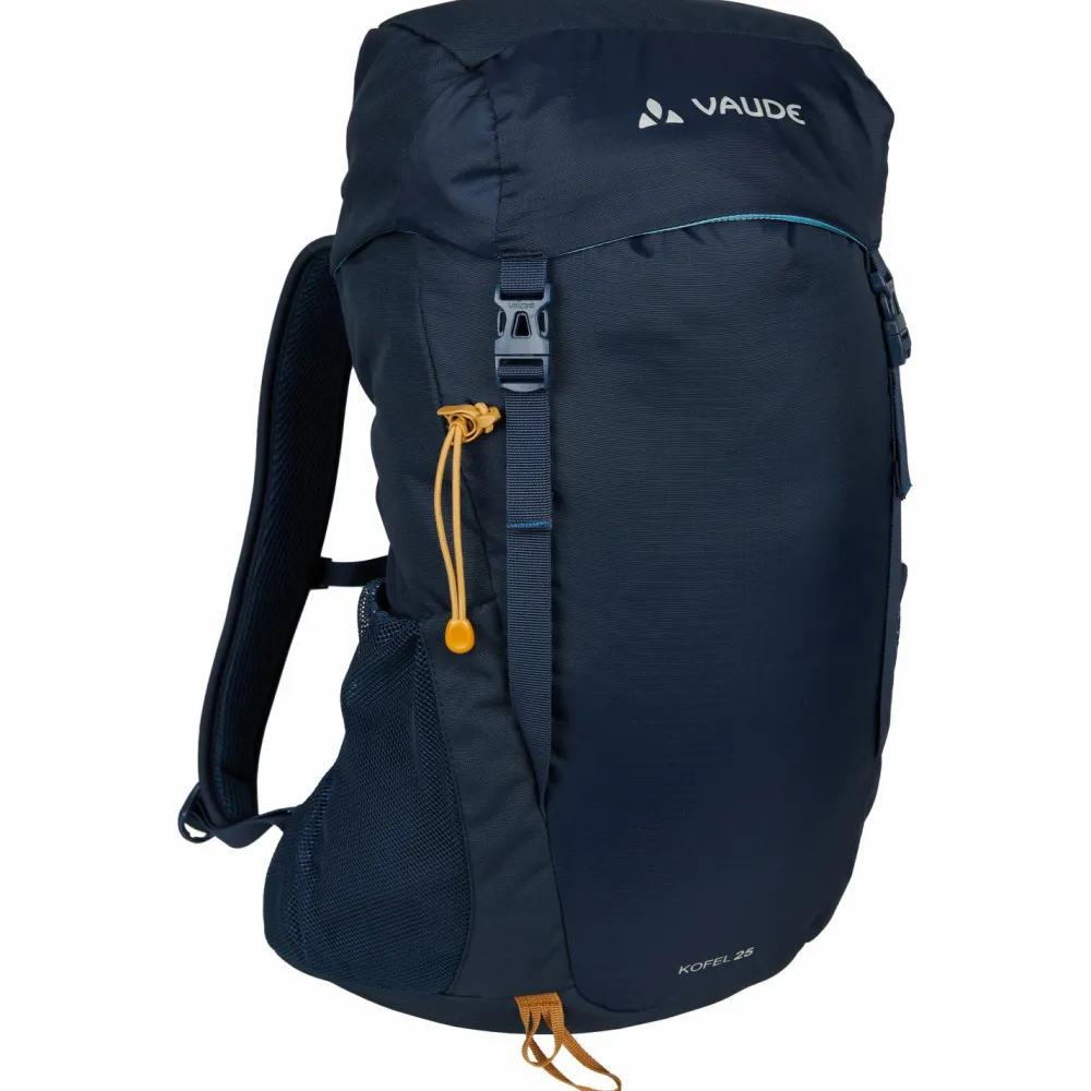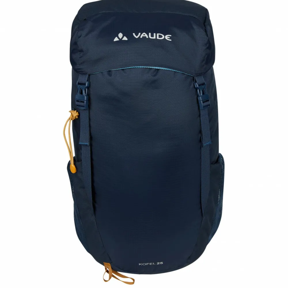 Der Kofel 25 Wanderrucksack von Vaude hat ein großes Hauptfach, ein Deckelfach mit Reißverschluss sowie zwei elastische Flaschenhalterungen. Das Hauptfach verschließt Du mit einem Kordelzug und dem überlappenden Deckelfach, sodass Regen zuverlässig draußen und Deine Sachen trocken bleiben.