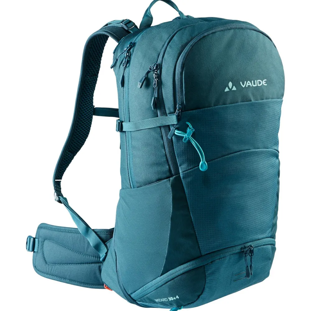 Der Wizard 30+4 ähnelt vom Design einem großen Trekking- oder Reiserucksack und kommt mit einem praktischen Bodenfach, das über eine zusätzliche Bodenfachtrennung verfügt. So können Teile der Ausrüstung gesondert aufbewahrt und transportiert werden. Bei Bedarf lässt sich die Bodenfachtrennung auch entfernen, sodass das Hauptfach auch bequem über den vorderen Reißverschluss erreichbar ist. Der Vaude Wanderrucksack ist für die Aufnahme von Trinksystemen vorbereitet und verfügt über seitliche Kompressionsriemen, Stockhalterung und Regenhülle.