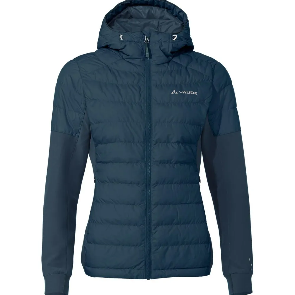 Der körpernahe, sportliche Schnitt sorgt für eine sehr gute Passform, die von den vorgeformten Ärmeln, den Stretch-Einsätzen und den teilweise elastischen Ärmelbündchen und dem Saum noch verbessert wird. Wichtige Mitnehmsel kannst Du in den beiden mit Reißverschlüssen gesicherten Fronttaschen verstauen, und ein Müsliriegel hat in der Innentasche Platz. Hergestellt ist die Women´s Elope Hybrid Jacket bis hin zur Isolierung aus recycelten Materialien, wodurch auch ihre Ökobilanz so sportlich ist wie die Passform. Vaude eben!