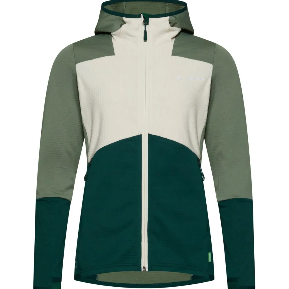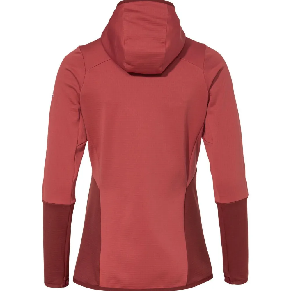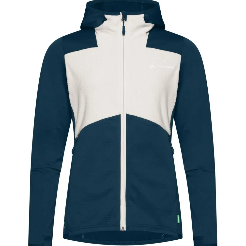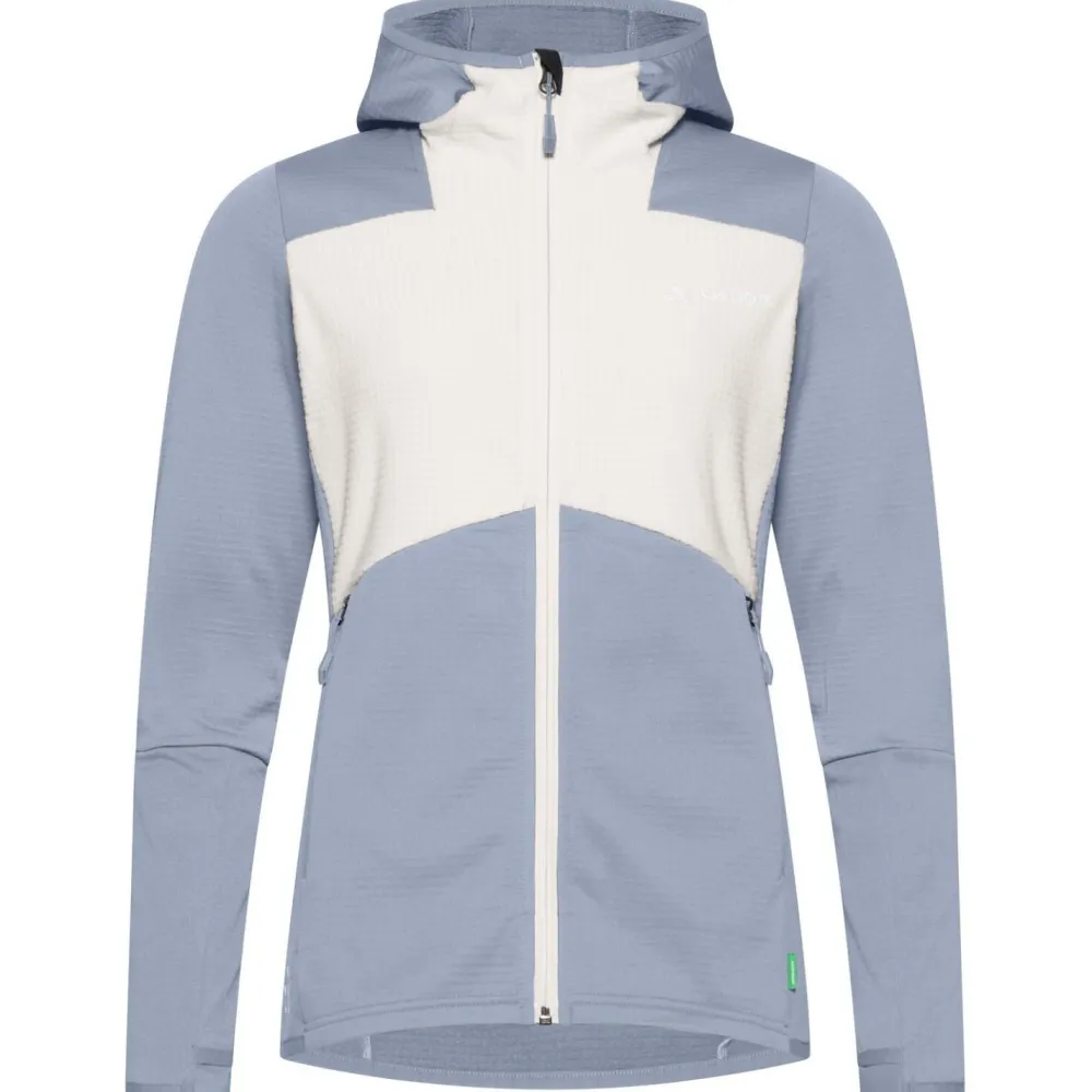 Die Women´s Monviso Hooded Grid Fleece Jacket von Vaude ist eine elastische Damen Fleecejacke für Skitouren und Bergsteigen. Am meisten Kälte verliert man im Winter über den Kopf. Die Kapuze ist angeschnitten und in der Weite verstellbar und sitzt so perfekt am Kopf. Damit kann man sich die Mütze sparen und hat trotzdem warme Ohren. Für Wertgegenstände, Müsliriegel und Co. gibt es zwei Fronttaschen. Diese sitzen etwas höher als man es vielleicht von anderen Jacken gewöhnt ist, sodass sie auch mit Gurt gut erreichen kann. Damit bleibt alles sicher und geht nicht im Schnee verloren. Außerdem ist die Jacke mit dem durchgehendem Frontreißverschluss mit Untertritt leicht an- und ausziehbar. Der Untertritt verhindert, dass Material in den Reißverschluss gezogen wird oder man sich einklemmt.