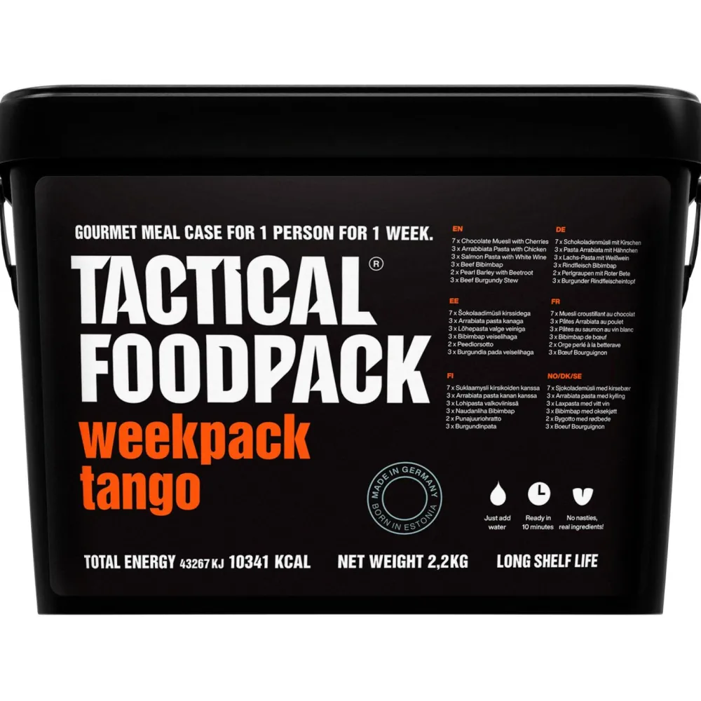 Egal ob auf mehrtägigen Trekkingtouren und Expeditionen unterwegs oder als Notfallvorsorge gelagert, bietet der Weekpack Tango von TACTICAL FOODPACK eine durchdachte Auswahl an nahrhaften, leckeren und lang haltbaren Fertiggerichten. Mit einem Gesamtgewicht von 2445 g und einer fertigen Essensmenge von 7875 g erhältst Du eine vollwertige Verpflegung für eine komplette Woche. Dieses Set ist ideal für alle, die sich auf ihre Abenteuer optimal vorbereiten möchten.