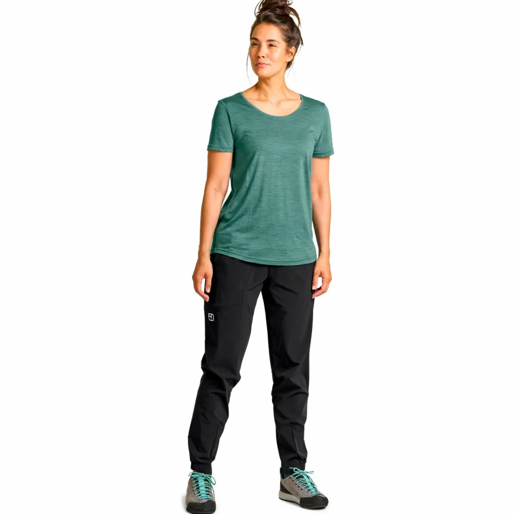 Mit dem Women’s 120 Cool Tec Clean T-Shirt von Ortovox bestreitest Du jeden Höhenmeter mit Bravour und einem guten Gefühl. Der geniale Materialmix aus nachhaltiger Mulesing-freier Merinowolle und Tencel botanischen Ursprungs liegt superangenehm weich auf der Haut und überzeugt mit tollen Eigenschaften. Es ist temperaturregulierend, kühlt bei sommerlichen Temperaturen und im Gegenzug wärmt es bei minus Graden, zudem ist es schnell trocknend, geruchshemmend, atmungsaktiv und langlebig.