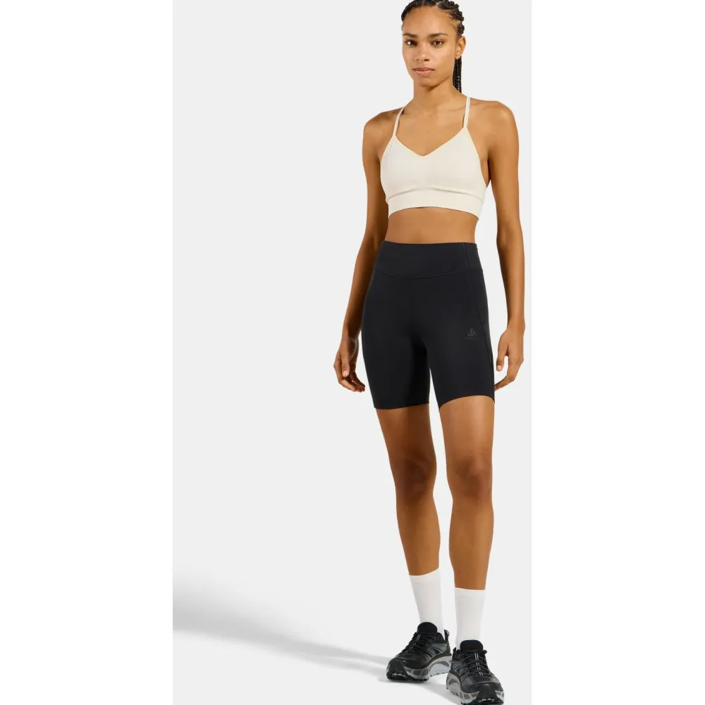 Die Women’s Essential Tights Short von Odlo eignet sich für hohe Temperaturen. Sie ist atmungsaktiv, schnelltrocknend und stretchy. Die Materialzusammensetzung besteht aus 73 % recyceltem Polyamid.
