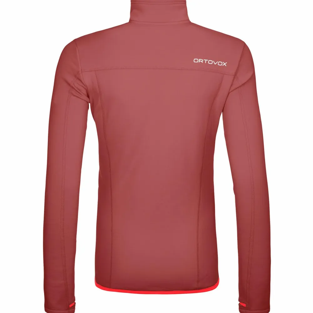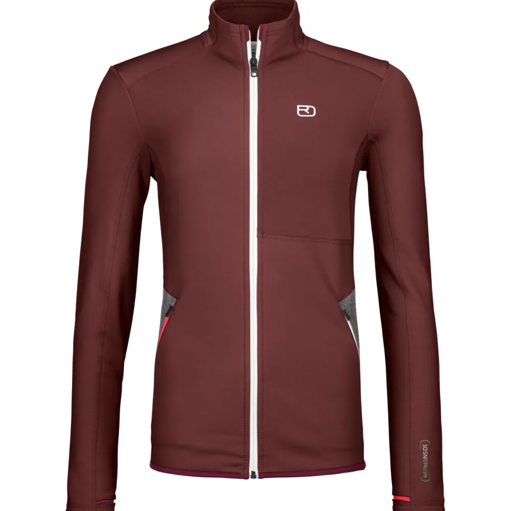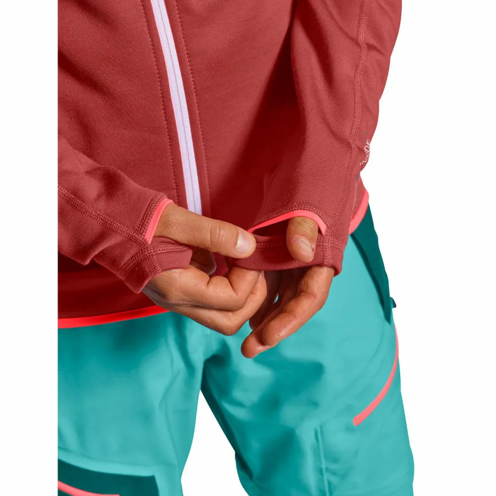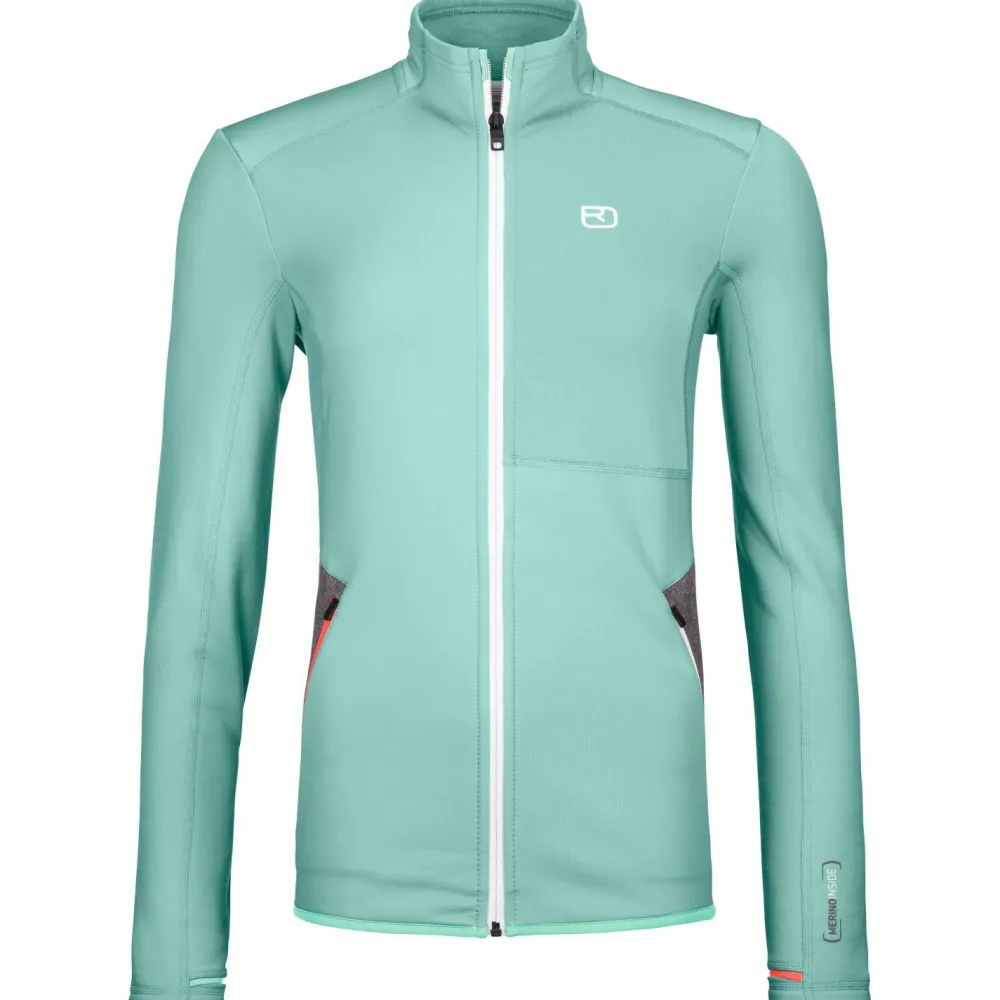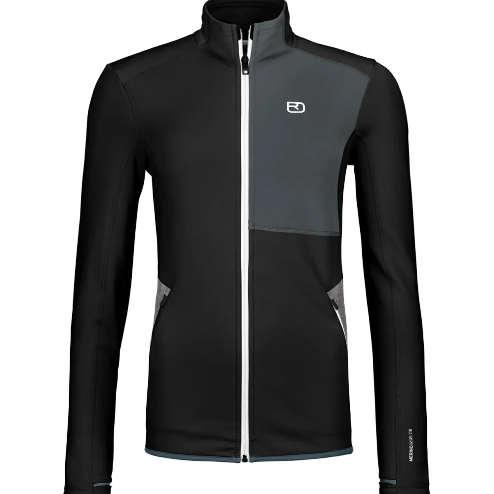 Die Women’s Fleece Jacket von Ortovox ist eine sehr hochwertige und robuste Jacke, die nicht nur sehr bequem, sondern auch funktional ist. Der Materialmix aus recyceltem Polyester außen und feinster Merinowolle auf der Innenseite ergibt ein sehr widerstandsfähiges und atmungsaktives Produkt. Die Wolle liegt angenehm weich auf der Haut, ist geruchshemmend und temperatur- und feuchtigkeitsregulierend, somit bleibt auch bei anstrengenden Passagen ein tolles Tragegefühl bestehen.
