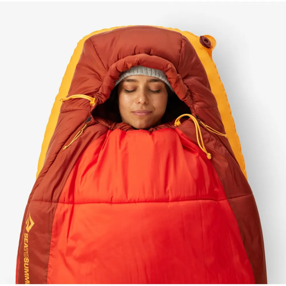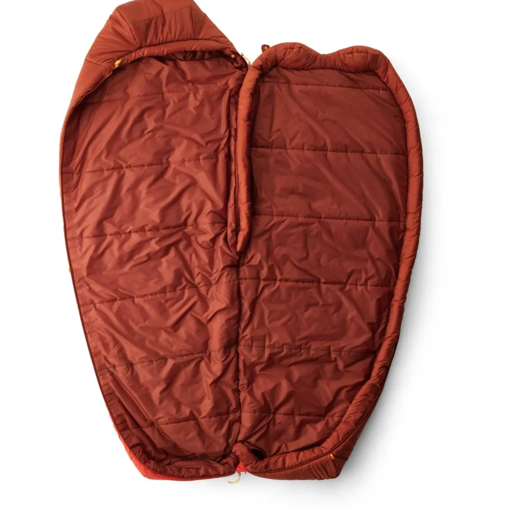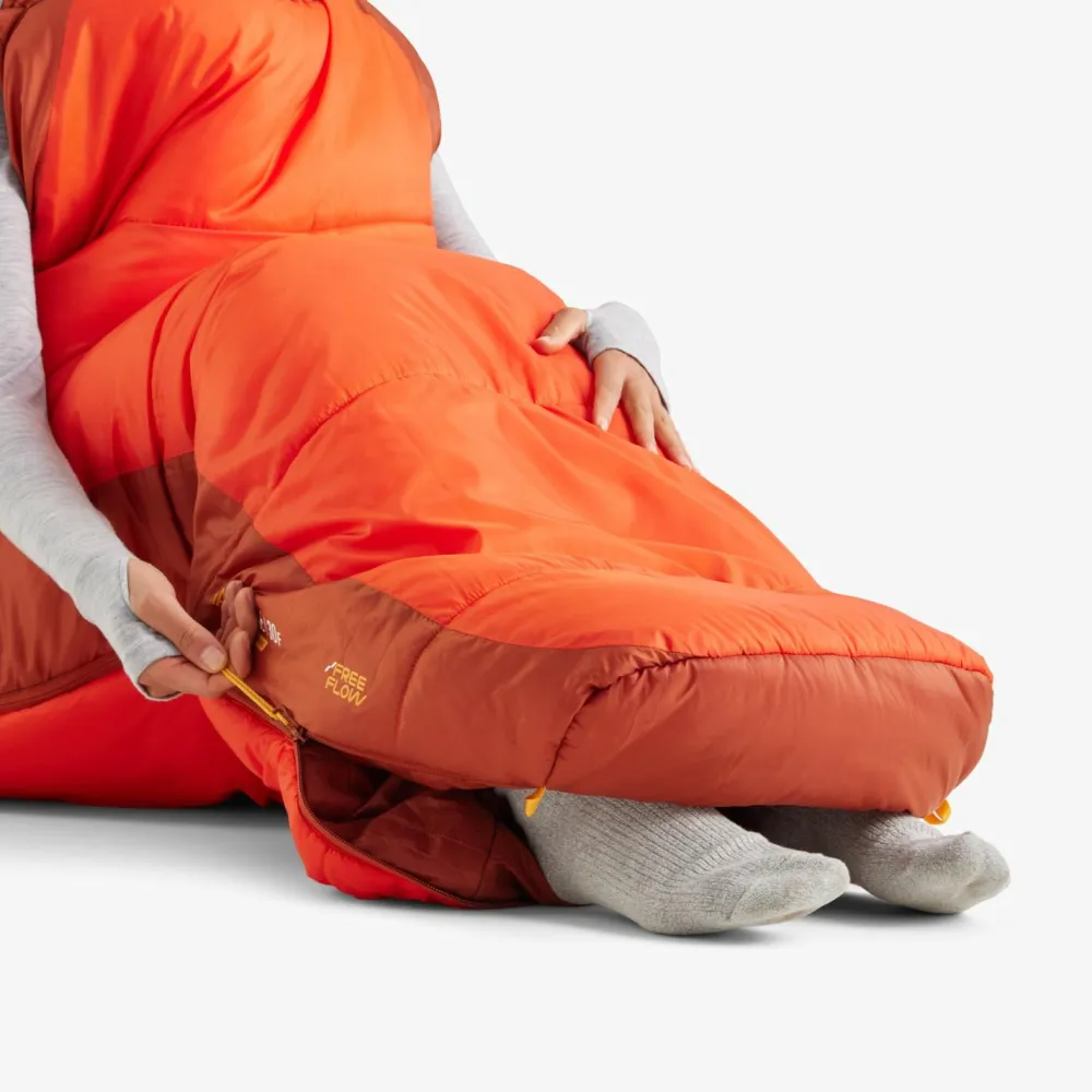 Die Relaxed Mummy Form bietet genug Platz und Bewegungsfreiheit, um sich auf die Seite rollen zu können, ohne dass die Isolierung zusammengedrückt wird. Das Free Flow Reißverschlusssystem erstreckt sich über die gesamte Breite und die Fußbox. Es bietet zusammen mit einem halblangen Reißverschluss auf der gegenüberliegenden Seite hervorragende Belüftung und besondere Vielseitigkeit.