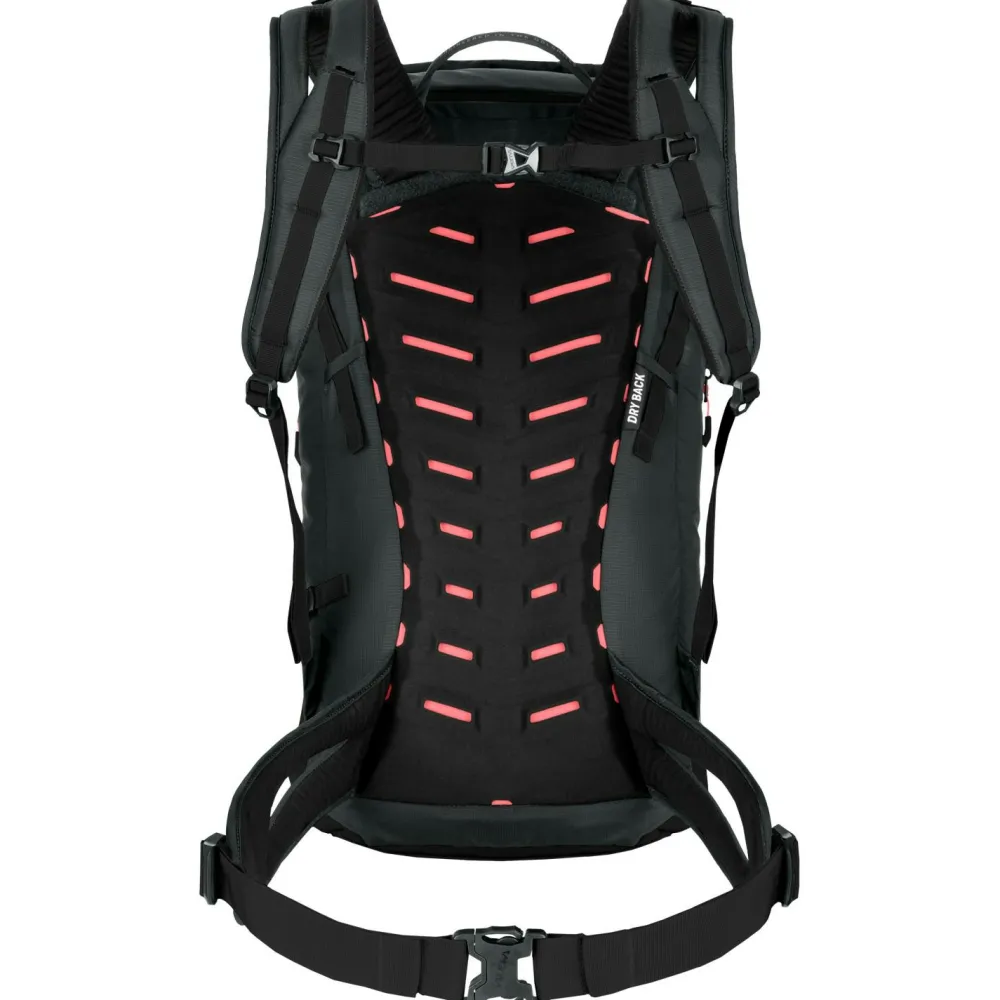 Das einfach verstellbare Dry Back Custom-Tragesystem verfügt über eine 3D-Kanal-Belüftung und ergonomisch geformte, gepolsterte, geteilte Schultergurte. Rückenlänge und Passform können individuell eingestellt werden. Außerdem gewährleisten die Lastkontrollriemen und der geteilte Hüftgurt eine gute Gesamtstabilität und eine gute Lastübertragung auf die Hüften. Zwei Seitentaschen, ein Ausgang für das Trinksystem, eine Daisy-Chain-Befestigung, eine Sicherheitstasche für Wertsachen mit Schlüsselhalter und eine seitliche Reißverschlusstasche für die Trinkflasche runden das durchdachte Design ab. Für einen eventuellen Wettersturz verfügt der Puez über wasserabweisende Reißverschlüsse und einen eigenen Regenschutz, der mitgeliefert wird.