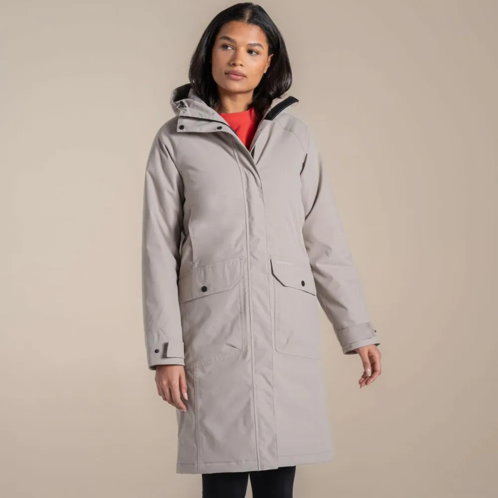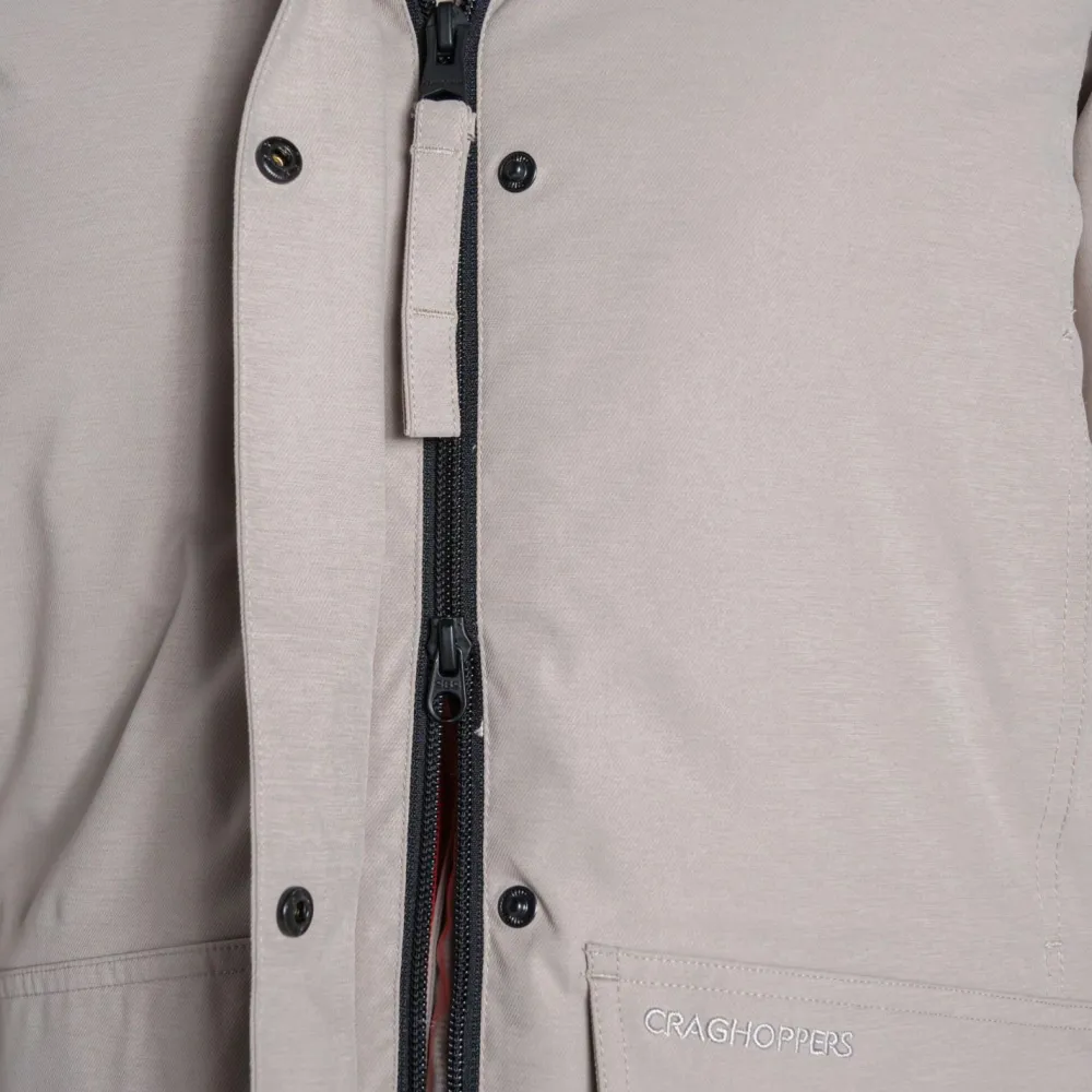 Der Outdoor-Mantel Women’s Rosalind II Jacket von Craghoppers aus recyceltem Twill-Polyester bietet Dir zuverlässigen Schutz bei nassem Wetter, ohne dass Du ins Schwitzen kommst. Die AquaDry-Membran und die vollständig verschweißten Nähte sorgen für eine Wasserdichtigkeit von 25.000 mm. Gleichzeitig ermöglicht die Atmungsaktivität von 20.000 g/m²/24h ein angenehmes Körperklima, selbst bei Bewegung. Die pflanzenbasierte H2OShield-Imprägnierung ist fluorcarbonfrei und damit eine umweltfreundliche Wahl für alle, die Wert auf Nachhaltigkeit legen. Die durchdachte Verarbeitung und das schlichte Design machen ihn zu einem vielseitigen Begleiter für Alltag und Freizeit.