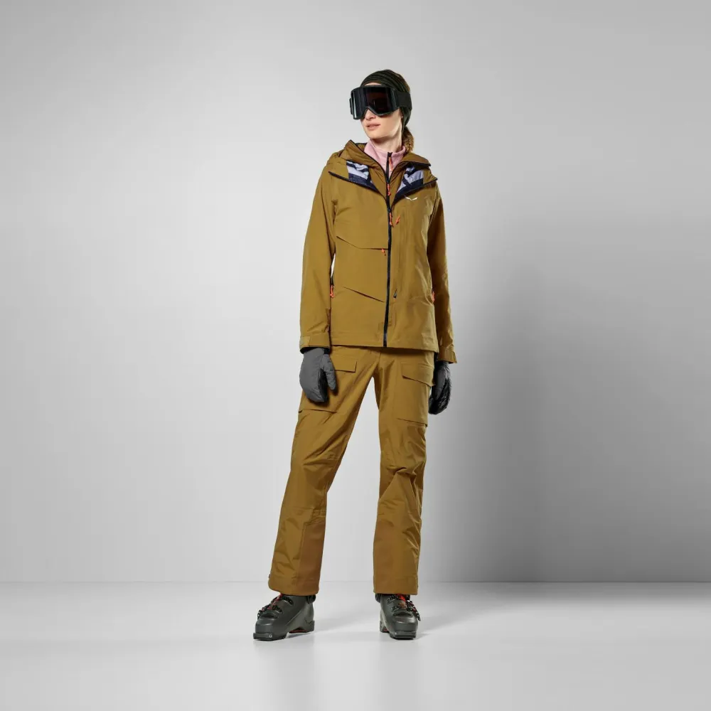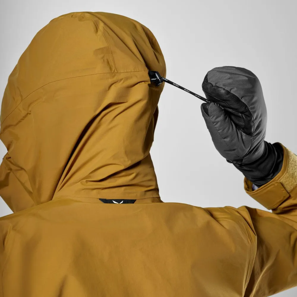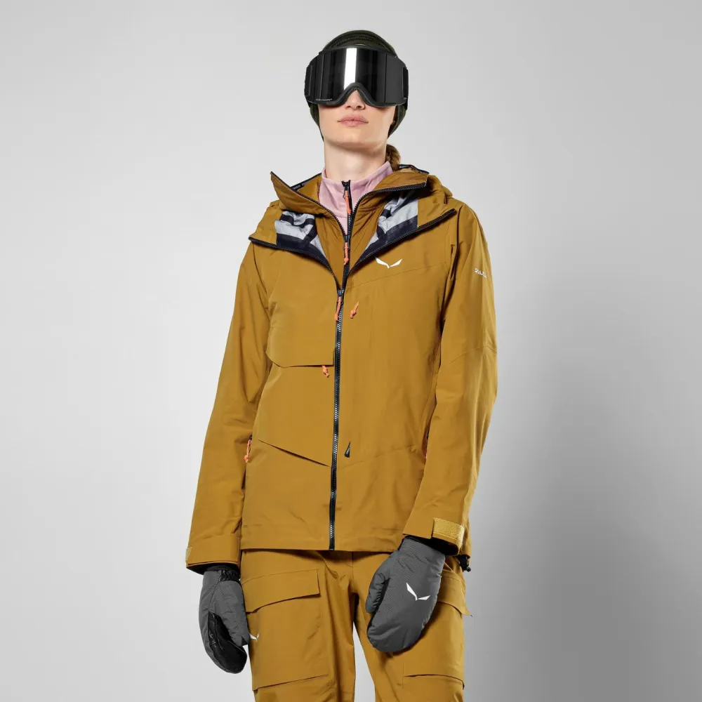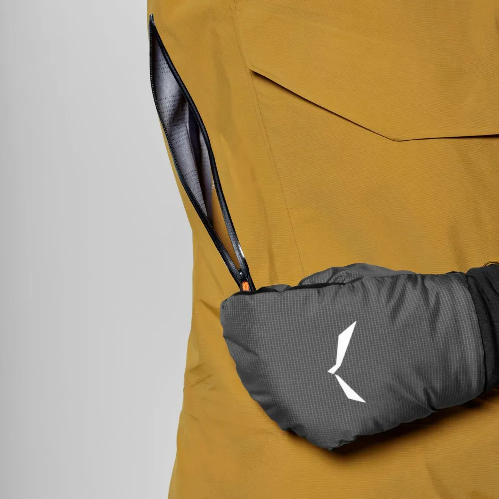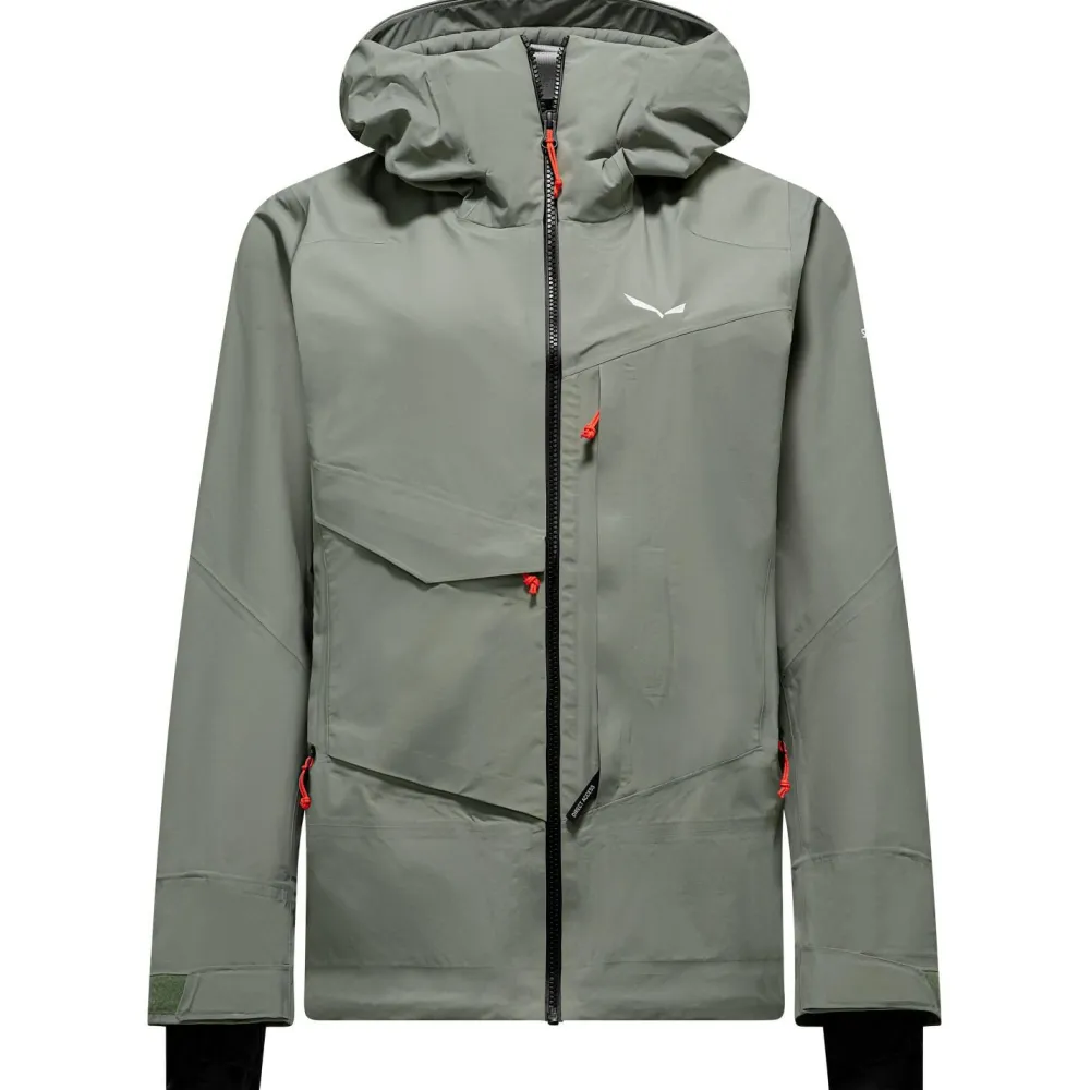 Mit ihrem integrierten Schneefang hindert die Salewa Jacke auch im tiefen Powder den Schnee am Eindringen. An den verstellbaren Ärmelenden sorgen elastische Innenbündchen mit Daumenschlaufen dafür, dass auch durch die Ärmel keine Nässe nach innen gelangt. Die Jacke ist komplett an den Nähten versiegelt und verfügt über eine praktische Innentasche für den Skipass.
