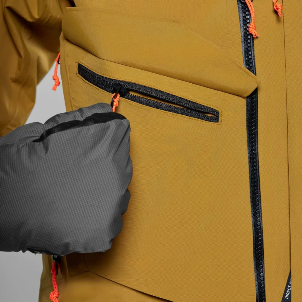Salewa stattet die Women’s Sella Free 3L PTX Jacket mit hohem Kragen, helmtauglicher Kapuze und integriertem Schneefang aus. Außerdem ergänzen zwei Frontaschen mit wasserabweisenden Reißverschlüssen und zwei Brusttaschen mit Direct-Access System für schnelleren Zugriff die Skitourenjacke.