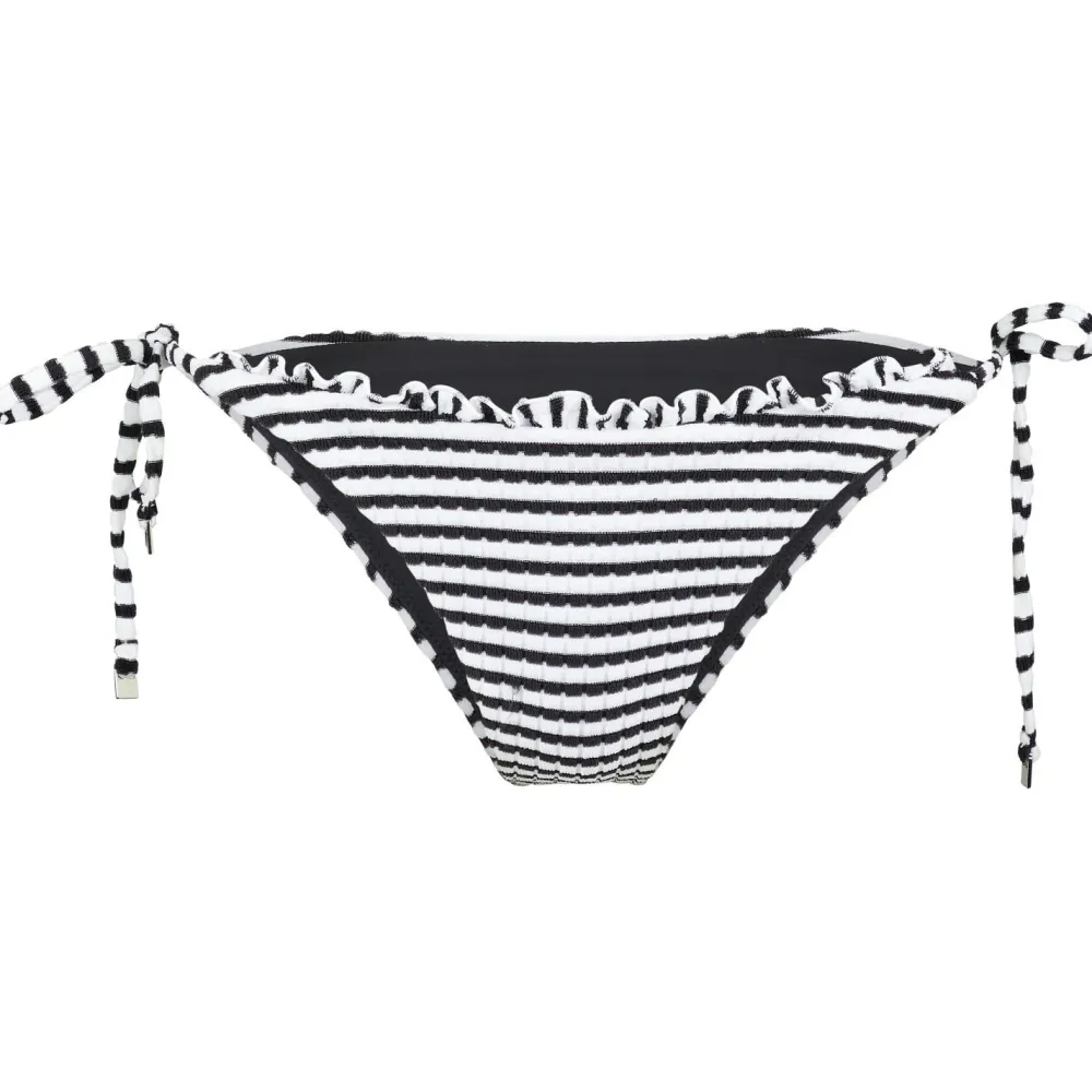 Die Women’s Sorrentostripe Tie Side Rio des australischen Labels Seafolly erinnert mit ihrem Retro-Streifen-Look und dem Frottier-Jacquard-Stoff an heiße Sommertage unter der italienischen Sonne. Die Bikinihose ist eher niedrig geschnitten und wird an der Seite gebunden. Hingucker sind feminine Details wie Rüschen und kleine metallische Verzierungen.