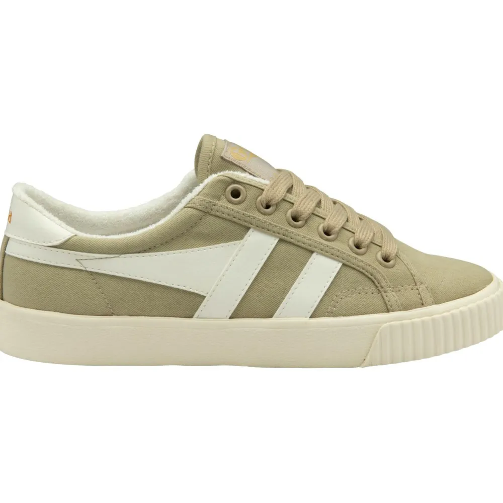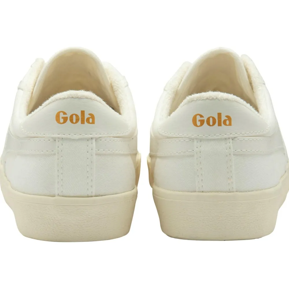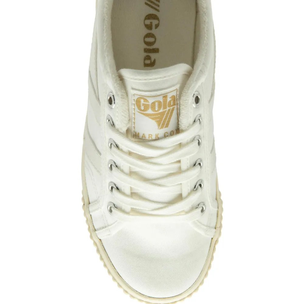 Der Women’s Tennis Mark Cox von Gola ist an das Schuhmodell des Tennisspielers Mark Cox angelehnt, welches er 1975 getragen hat. Die Kombination aus cremeweißem Stoff mit blauen Kunstlederapplikationen und den goldenen Gola-Schriftzügen auf der Zunge sowie der Ferse sorgen für einen richtig coolen Retro-Look. Er passt somit perfekt zu dem Stil, den Gola-Sneaker verkörpern möchten.