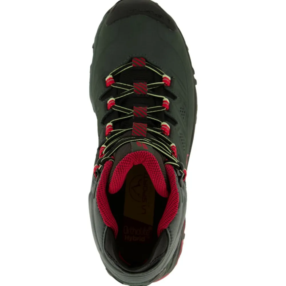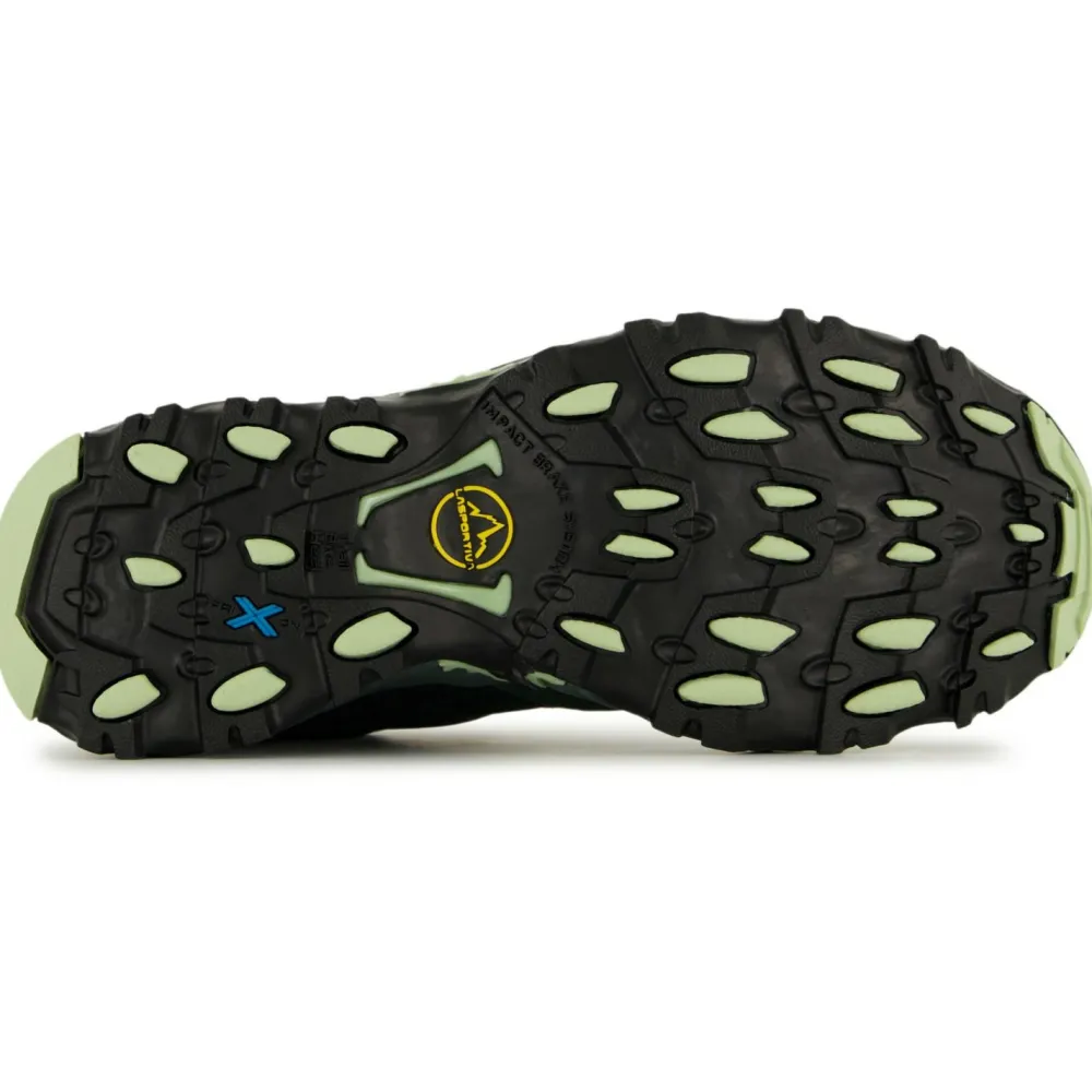 Ein stabilisierender Ferseneinsatz sorgt für Schutz vor äußeren Einwirkungen und für perfekte Kontrolle auf Querpassagen. Die FriXion Blue-Sohle aus weicher XF-Mischung mit geprägtem Trail Bite Heel-Aufsatz sorgt für bessere Bremseigenschaften beim Bergablaufen. Eine perfekte Volumenregulierung und Umhüllung des Fußes ist dank des besonderen Schnürsystems immer gewährleistet. Die Ösen auf der Innenseite des Obermaterials sind angenäht und auf der Außenseite verstärkt: Dieses System ermöglicht eine Aufteilung der Spannung der Schnürung auf das ganze Obermaterial des Women’s Ultra Raptor II Mid Leather Wide GTX.