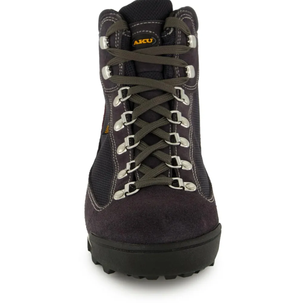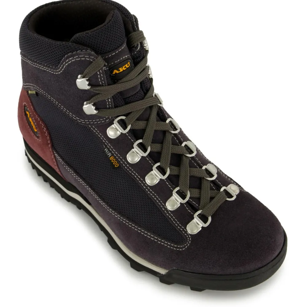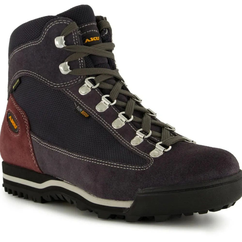 Seit 30 Jahren in Italien ein beliebter Klassiker und immer noch up to date! Das ist fast schon wie ein Qualitätssiegel und spricht für die hervorragenden Eigenschaften des knöchelhohen Women’s Ultralight Micro GTX von AKU zum Wandern, hier als Frauenmodell. Die Farbkompositionen des Schuhs werden stets aktualisiert, so dass die Modelle neben der bewährten Funktionalität und dem Gehkomfort eine wahre Freude sind für die modebewusste Frau am Berg und im Tal. Sie passen zu den jeweils modisch aktuellen Farben der Outfits.Wie der Name besagt, ist der Schuh ein Leichtgewicht und weist alle Vorzüge eines GORE-TEX Schuhes auf, also: Wasser- und Winddichtigkeit sowie Atmungsaktivität. Für eine ausgezeichnete Atmungsaktivität sorgt neben der Membran die Konstruktion des Obermaterials, das AKU-System 8000. Es wurde bereits 1991 entwickelt und – da wirklich innovativ und richtungsweisend – patentiert. Laut firmeneigenen Labortests ist die Atmungsaktivität dabei bis zu 11,5 Mal höher als bei normalen Standards mit GORE-TEX. Auch heute zählt diese Konstruktion des Obermaterials noch zu den besten Technologien bei leichten Wanderschuhen, wenn es um eine hohe Atmungsaktivität geht.Hinzu kommen die gute Passform und der Grip der Vibram Sohle Erica Everest, der zwar nicht für den Everest reicht, aber für mittelschweres Gelände ideal ist. Der Aufbau des Schuhs bietet genügend Halt und eine gute Seitenstabilität. Ob man nun leichtfüssig wie ein Reh durch die Wälder und Auen sprintet, als Hobby-Älplerin hinter den Kälbern herrennt, den Schuh als Landschaftsgärtnerin trägt oder in den warmen Regionen der Erde damit pilgert – der Women’s Ultralight Micro GTX passt immer und überall.