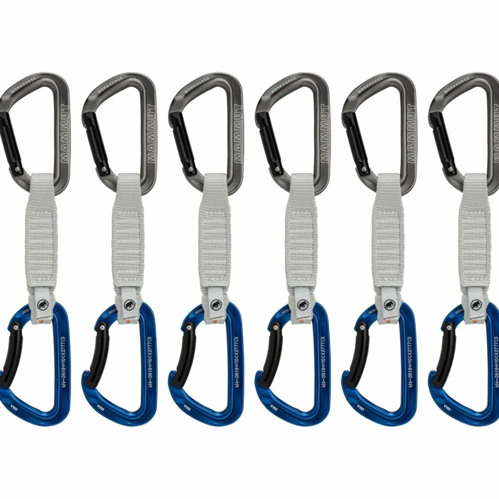 Das Workhorse Keylock Quickdraws Express-Set von Mammut setzt Maßstäbe in Handling und Leistung. Der ergonomisch geformte Karabiner liegt perfekt in der Hand. Seine großzügige Geometrie, die geriffelte Griffzone am geraden Schnapper und die verbesserte Keylock-Nase erleichtern das Clippen sowie Ein- und Aushängen. Die innovative Profil-Konstruktion macht ihn besonders robust und spart gleichzeitig Gewicht. Die Polyesterschlinge ist gut zu greifen, ein robuster Schlingenschutz fixiert den unteren Karabiner und verringert den Verschleiß. Ein Indikator in kräftigem Orange zeigt an, dass Schlinge und Fixierung korrekt am Karabiner hängen. Du kannst Dich ganz aufs Klettern konzentrieren.