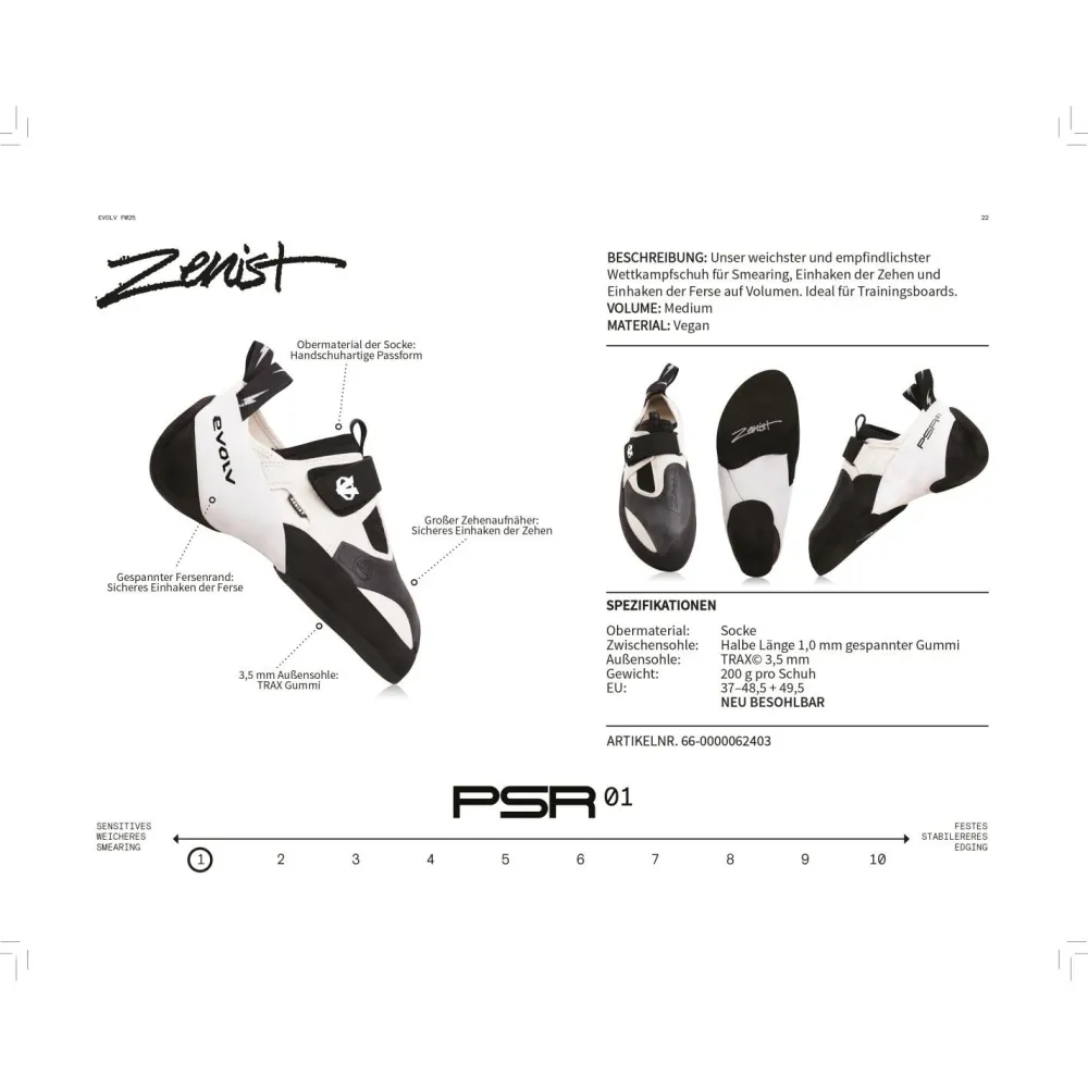 Die Zenist zeichnen sich durch einen sehr aggressiven Downturn und eine moderate Asymmetrie aus. Außerdem haben sie eine 3,5 mm dünne, zweiteilige Sohlenkonstruktion, die den Schuh relativ weich und flexibel macht. Dadurch eignen sie sich besonders gut für stark überhängende Wände wie Trainingsboards oder für das Auf-Reibung-Stehen, wie es bei vielen modernen Boulderproblemen erforderlich ist. Die moderate Vorspannung erleichtert das Einhaken mit der Ferse und verbessert so zusätzlich die Überhangqualitäten der Schuhe.
