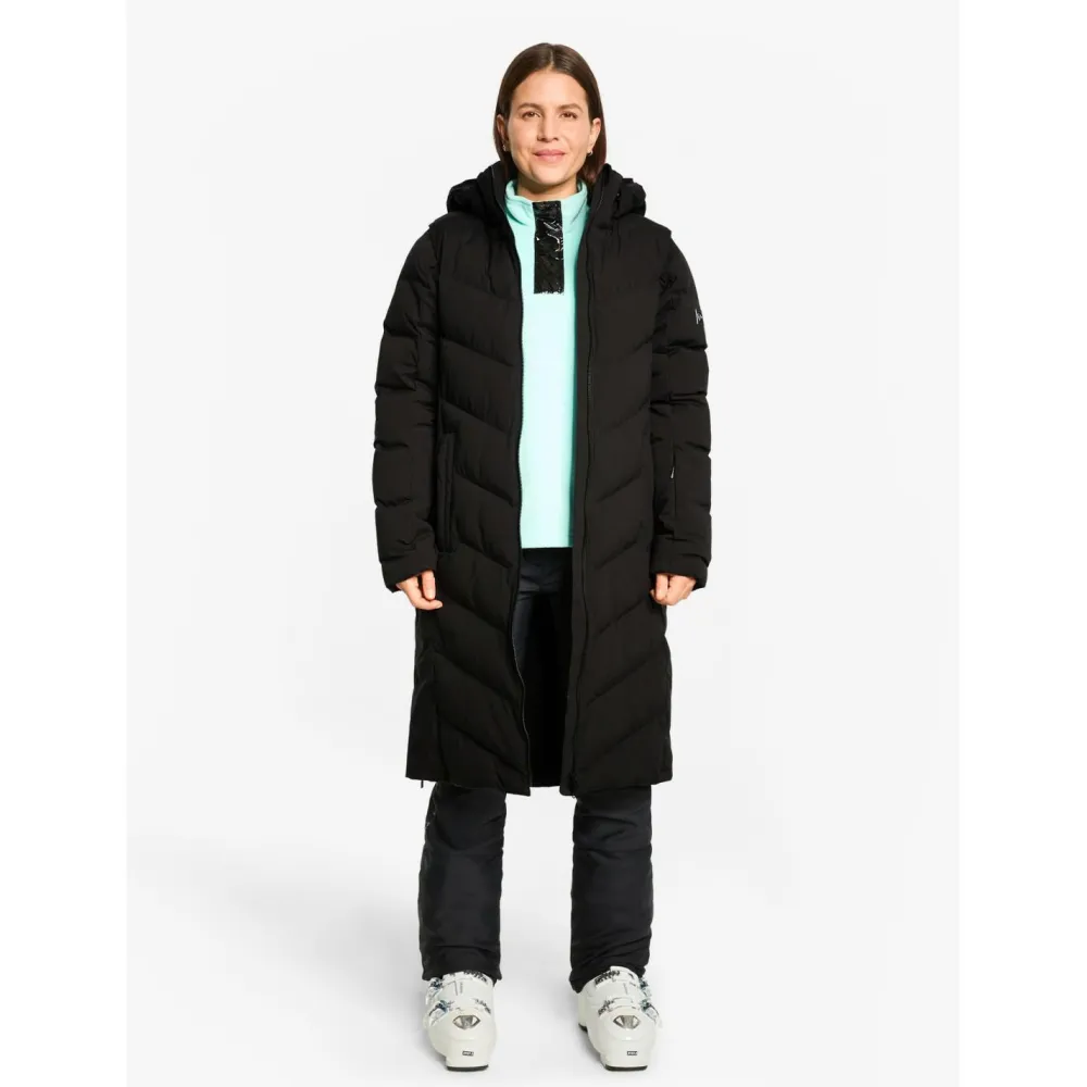 Die Wattierung mit Comfortemp bietet angenehme Wärme bei gleichzeitig geringem Gewicht. Ein elastisches Innenfutter sorgt für optimale Bewegungsfreiheit, während der ergonomische Schnitt sportlich wirkt. Praktische Features wie die feste, verstellbare Kapuze und die Skipasstasche machen den Mantel zum idealen Begleiter für Alltag und Piste.