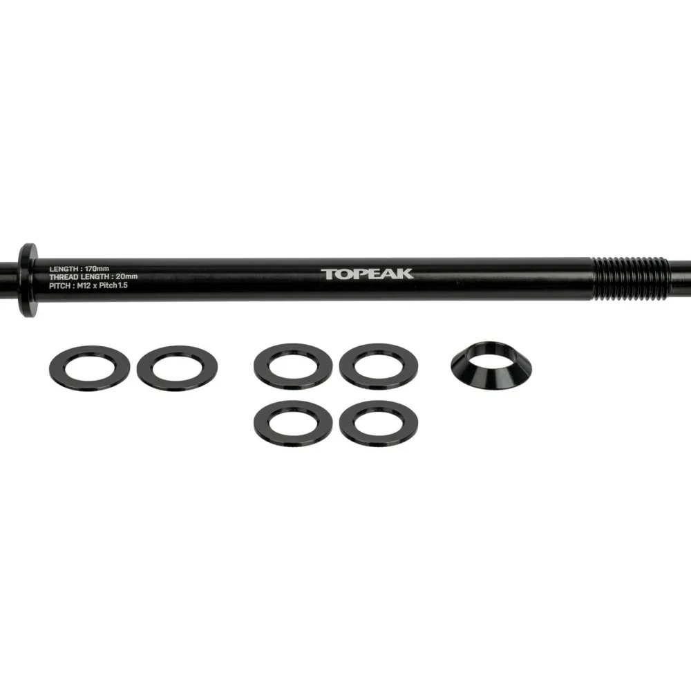 Die Zi:RAK Thru-Axle 12 x 1,5 mm von Topeak ist eine spezifische Steckachse für 700C-Rennräder, Gravelbikes und 29-Zoll-MTBs bis 2,6 Zoll Reifenbreite. Sie besteht aus leichtem Aluminium, ist 170 Millimeter lang und wiegt je nach eingesetzten Spacer-Kombinationen zwischen 50 und 60 Gramm. Ideal als Ergänzung zu den Zi:RAK-Gepäckträgersystemen.